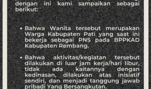Dengan adanya klarifikasi ini, BPPKAD berharap masyarakat dapat memahami bahwa aksi viral tersebut adalah urusan pribadi ASN bersangkutan dan tidak mencerminkan sikap maupun kebijakan resmi Pemerintah Kabupaten Rembang.(Red.)