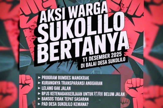 PATI, PortalMuria.com — Peredaran pamflet bertajuk “Aksi Warga Sukolilo Bertanya” terus menjadi perbincangan hangat di masyarakat. Poster ajakan aksi itu berisi undangan untuk berkumpul pada 11 Desember 2025 di Balai Desa Sukolilo dengan sederet isu yang dianggap penting oleh warga. Namun hingga kini, keberadaan penanggung jawab aksi tersebut masih menjadi teka-teki.