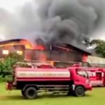 Gudang produksi PT Pijar Sukma Furniture di Desa Kecapi, Jepara, dilalap kebakaran hebat. Akses tertutup tembok tinggi membuat pemadaman terkendala, polisi imbau warga menjauh.