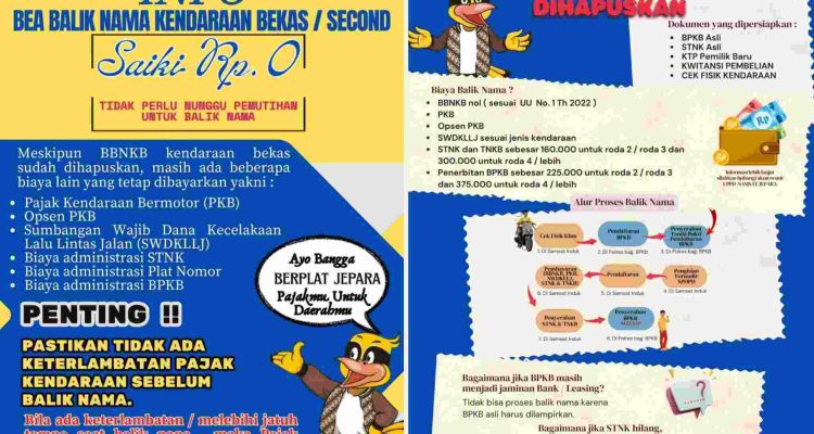 Kabar baik bagi masyarakat Jepara yang hendak melakukan balik nama kendaraan bekas. Pemerintah melalui Bapenda Jepara resmi menghapus Bea Balik Nama Kendaraan Bermotor (BBNKB) untuk kendaraan bekas atau second. Artinya, biaya balik nama kini Rp 0 alias gratis!