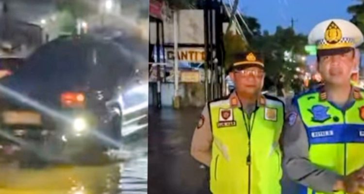 Luapan Sungai Jati Pasean menggenangi Jalan Raya Kudus–Pati di Desa Hadipolo, Jekulo. Satlantas Polres Kudus dan Polsek Jekulo sigap mengatur lalu lintas demi keselamatan pengendara.