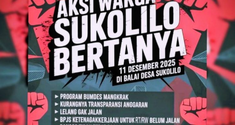 Famflet ajakan aksi warga Sukolilo beredar luas. Seorang warga membenarkan rencana aksi dan mengungkap masalah Bumdes, namun Polsek Sukolilo belum dapat dikonfirmasi terkait peredaran famplet tersebut.